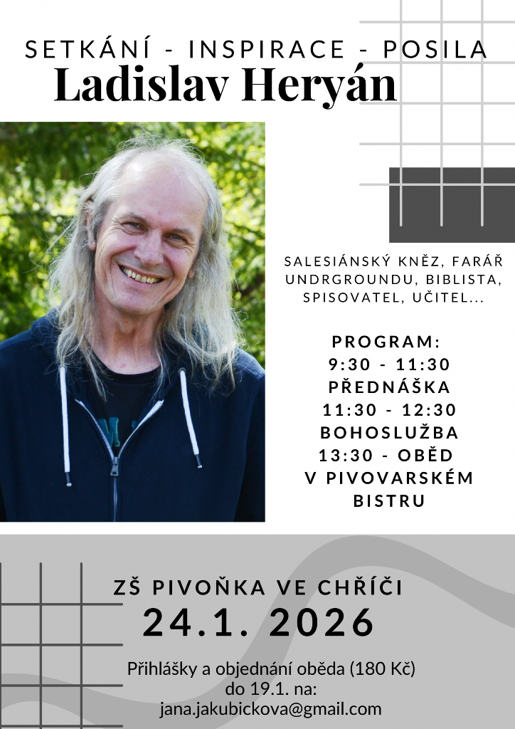 Poněkud neortodoxní a velmi zajímavý kněz, selesián Ladislav Heryán bude mít ve škole přednášku a poté bude následovat bohoslužba. Pokud si objednáte i oběd, můžete se v pivovaru i najíst. Setkání s Ladislavem Heryánem se koná v sobotu 24.1. 2026 od 9:30 ve škole Pivoňka v Chříči.
